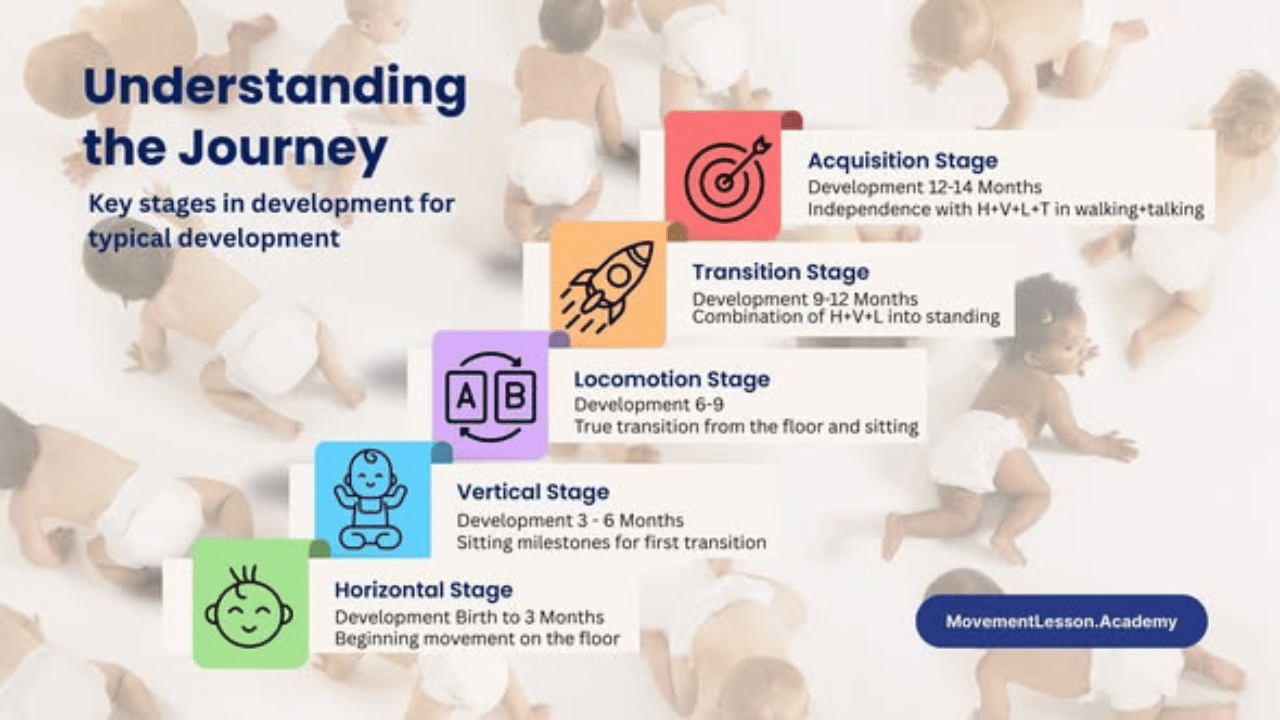 Each developmental milestone (rolling, reaching, looking) builds the foundation for the next.